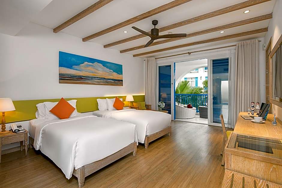 Twin Junior Suite with Terrace or Pool view : This spacious junior suite comes with a terrace or main pool view. Our Junior Suites are thoughtfully located around the main pool area, offering you a complete and serene getaway. You can enjoy peaceful pool or garden views, providing a tranquil and comfortable escape from the bustling city.